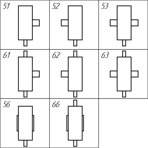 Варианты сборки 52 (51,53,56,61,62,63,66), вариант крепления 1(2), вариант расположения червячной пары 1